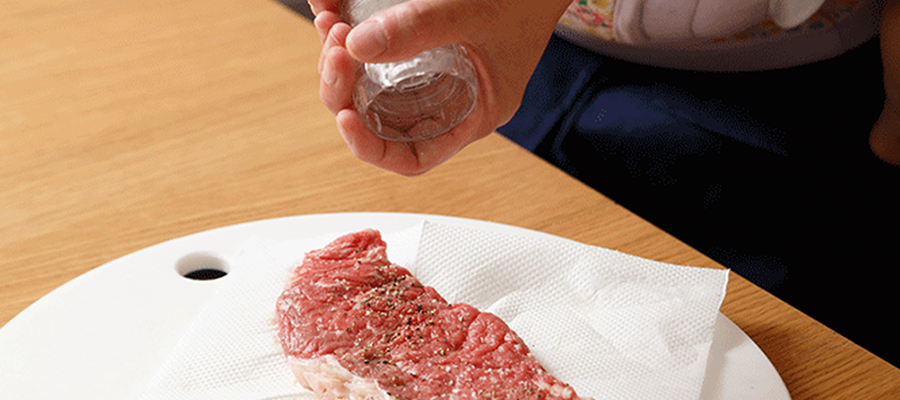 切り込みを入れた面(盛り付けた時に表になる面)に塩こしょうをふります。塩は味を付けるだけでなく、お肉の旨みを封じ込めて身をぎゅっと引き締めてくれます。ただ早くに塩を振ってしまうと、お肉の水分と一緒に旨味も出てしまってパサつきの原因にもなるので、必ず焼く直前に振りましょう。